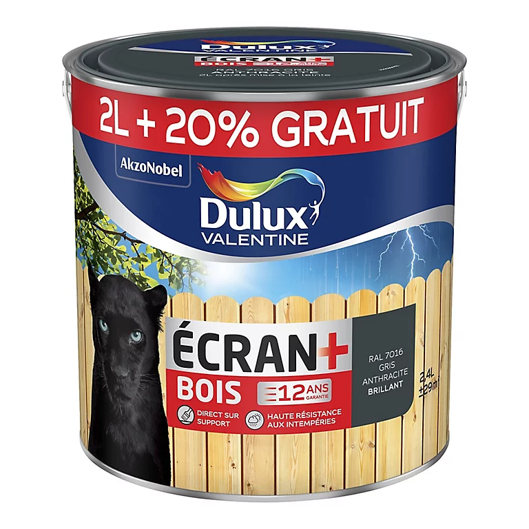 La peinture bois intérieur extérieur Dulux Valentine gris anthracite 2L + 20% à destination des supports en bois possède une Formule glycéro satinée spécialement conçue pour durer longtemps, résister aux agressions des intempéries et apporter un beau résultat.