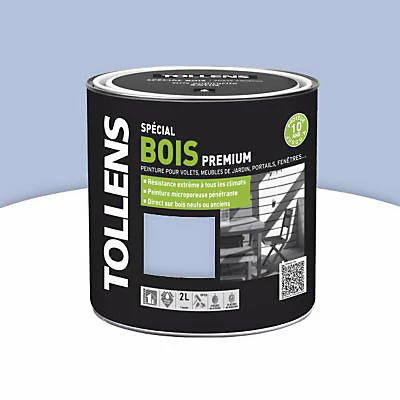 La peinture bois extérieur Tollens bleu lavande satin de 2L est une peinture laque glycérophtalique satinée, très résistante, conçue pour la décoration et la protection durable des boiseries extérieures: portes, volets, meubles de jardin, fenêtres, clôtures…
