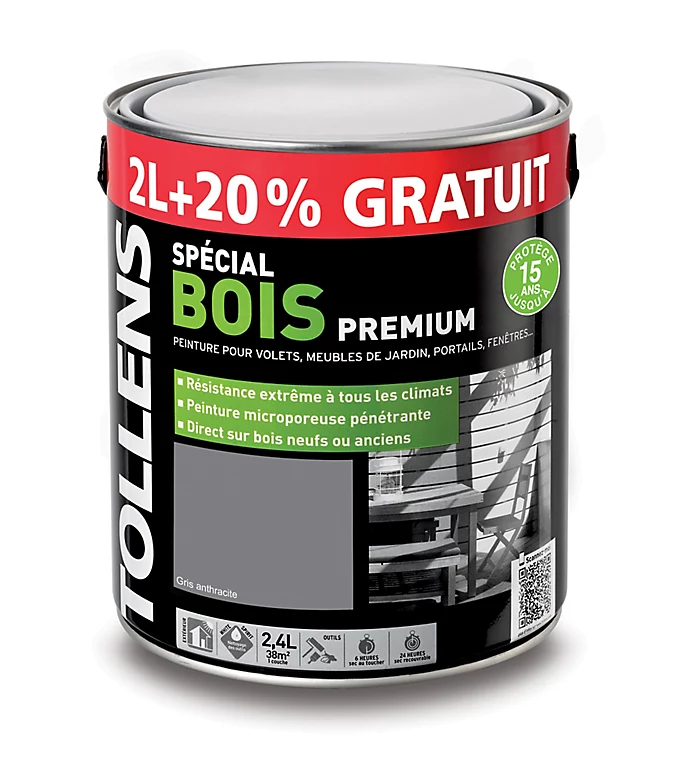 La peinture bois extérieur Tollens gris anthracite satin de 2L + 20% gratuit est une peinture laque glycérophtalique satinée, très résistante, conçue pour la décoration et la protection durable des boiseries extérieures: portes, volets, meubles de jardin, fenêtres, clôtures…