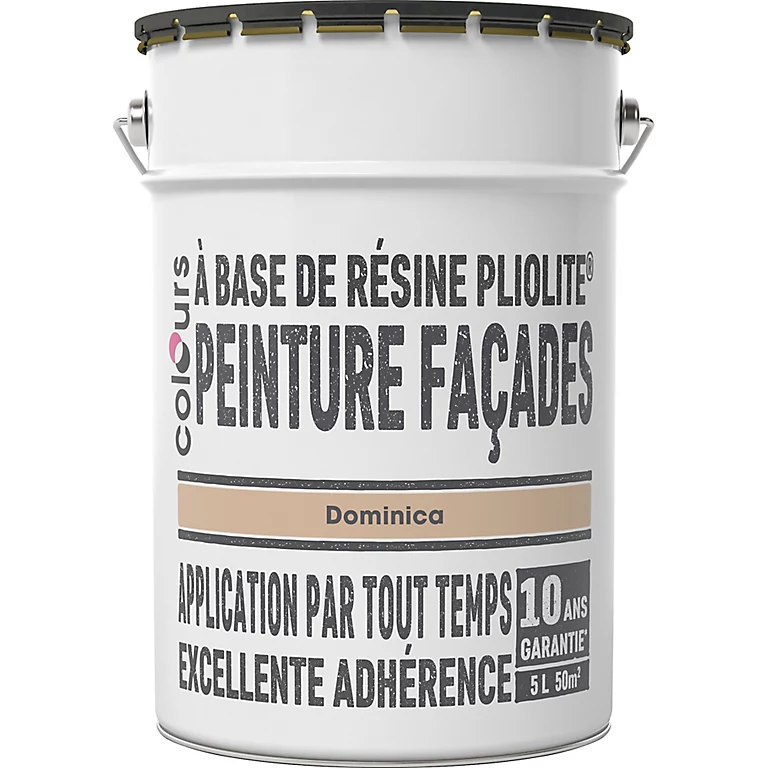 La peinture façade Colours Dominica à base de PLIOLITE® est une peinture d’extérieur durable de qualité professionnelle spécialement formulée pour tolérer et supporter des températures extrêmes pendant et après l’application. Elle peut être utilisée presque toute l’année, sur tous les types de surfaces, et permet un haut pouvoir couvrant. Elle offre une couleur vive, longue tenue et ne s’écaille pas. Sa formule bénéficie d’une grande puissance de pénétration, ce qui permet une excellente adhérence sur tous les types de substrats minéraux. Elle empêche l’eau de pénétrer tout en laissant l’humidité s’échapper de votre maison. La contenance est de 5 litres.
