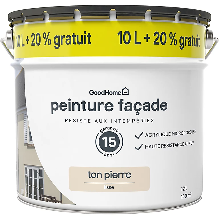 La peinture façade GoodHome ton pierre est un excellent moyen d’apporter de la couleur et du caractère à votre maison. Elle empêche l’eau de pénétrer tout en laissant l’humidité s’échapper. Dotée d’un bon pouvoir couvrant, elle permet d’éviter la décoloration et d’offrir une couleur longue tenue. Tous nos produits sont résistants aux intempéries, afin de protéger vos murs extérieurs des conditions météorologiques les plus difficiles. La contenance est de 12 litres.