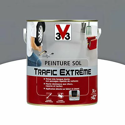 La peinture V33 Trafic Extrême gris foncé satin, à base de résine alkyde-uréthane en phase solvant, est destinée principalement à un usage intérieur pour tous les sols très sollicités (haute résistance à l’abrasion et aux taches : garage, atelier…). Si besoin, elle peut cependant être appliquée en extérieur pour cet usage.
